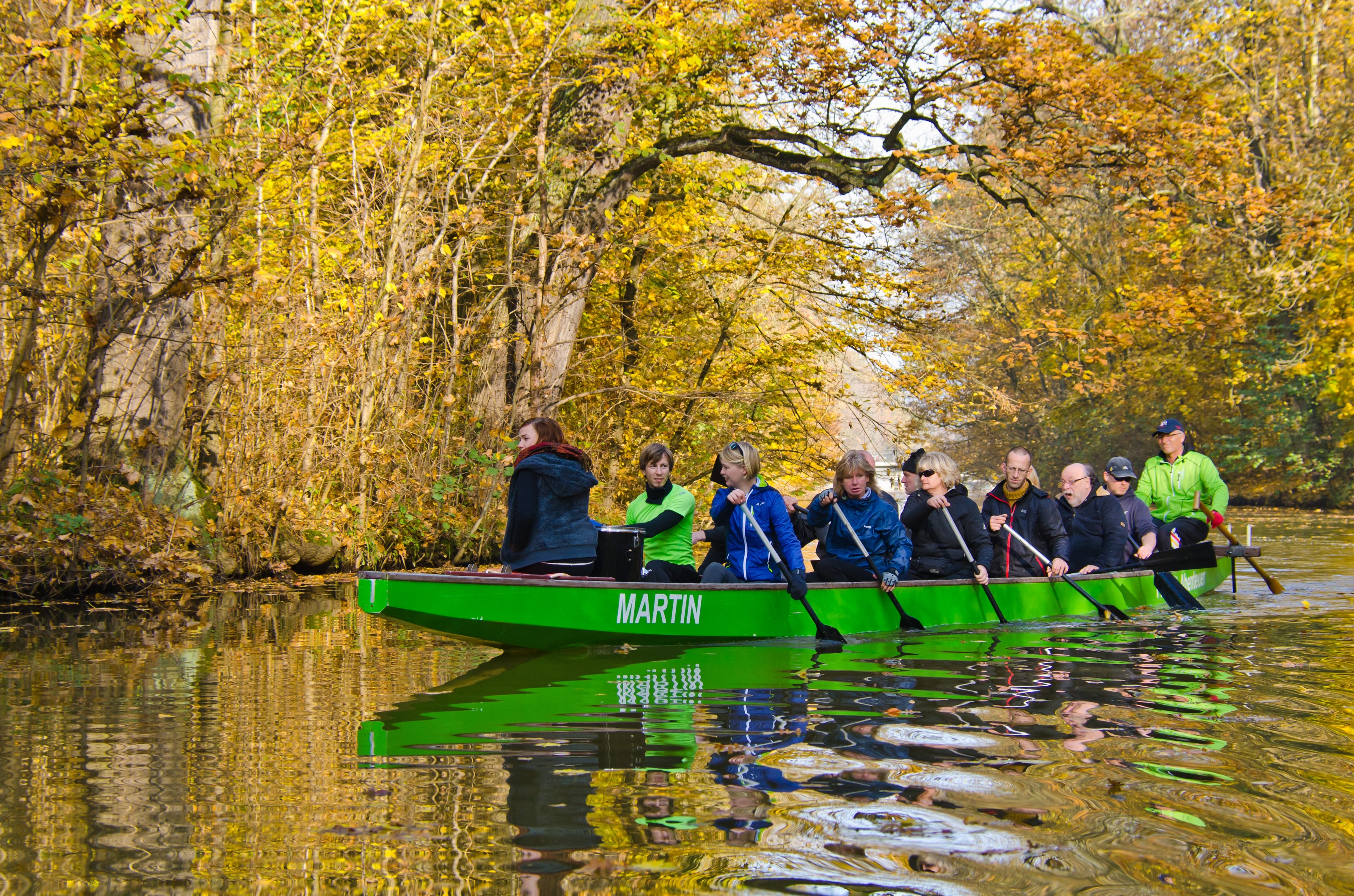 Alle in einem Boot! Der Name ist hier Programm. Nur wenn alle zusammen paddeln, kommen wir ans Ziel! Bei unseren Guides seid ihr in guten Händen und könnt die Wasserwege Leipzigs an Bord eines unserer Großboote erkunden.